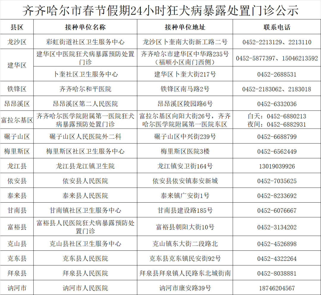 如果在春节假期期间,发生了猫爪狗咬等动物伤人事件,广大市民不用惊慌,记者从齐齐哈尔市疾控中心了解到,齐齐哈尔市所有区县(市)都配置了24小时狂犬病暴露处置门诊,市民可以随时前往及时进行处置。