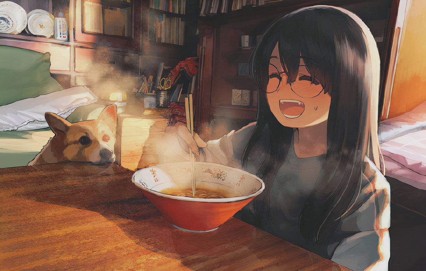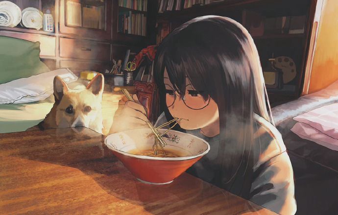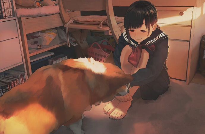 上面这张同人图也是很有意思,吃饭的时候小狗狗在旁边看着,相比起小狗狗“面无表情”的样子,这妹子吃了好吃的东西之后一脸满足的模样更是很有爱呢,我记得小时候在农村,大家养猫养狗的时候,吃的东西真的不讲究,很多时候就是人类的剩菜剩饭啥的,如果有时候吃个小鸡吃个排骨啥的,家里的猫猫狗狗也跟着高兴,可以吃点骨头啥的了,不像现在,有时候宠物们可能吃得比人的还要好,给买高级狗粮啥的,而且据一些资深的宠物爱好者说还不能给猫猫狗狗吃人类吃的,因为那些东西可能盐分油脂啥的超标,宠物吃了不好啥的,嘛,不过想起一起自己吃好吃的东西的时候,猫猫狗狗在一边望着的场景还是有点怀念的。