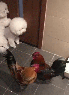 可是一切的宁静被过年这几天打乱了,网友过年回来的时候,父母非要让他带两只公鸡回去,网友也不好托辞,就千里迢迢带回了家,带回家的第一天,狗子和猫咪都很好奇,一直扒着门观看~