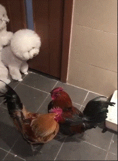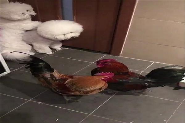 网友为了防止它们抓门,就让它们共处一室,还没一会的功夫,狗狗和猫咪已经吓得,一个跑到洗脸盆上,一个躲在角落里,公鸡稍微一叫唤,狗子都快被吓尿了,场面一度尴尬,用一句歌词解释就是最怕空气突然安静~