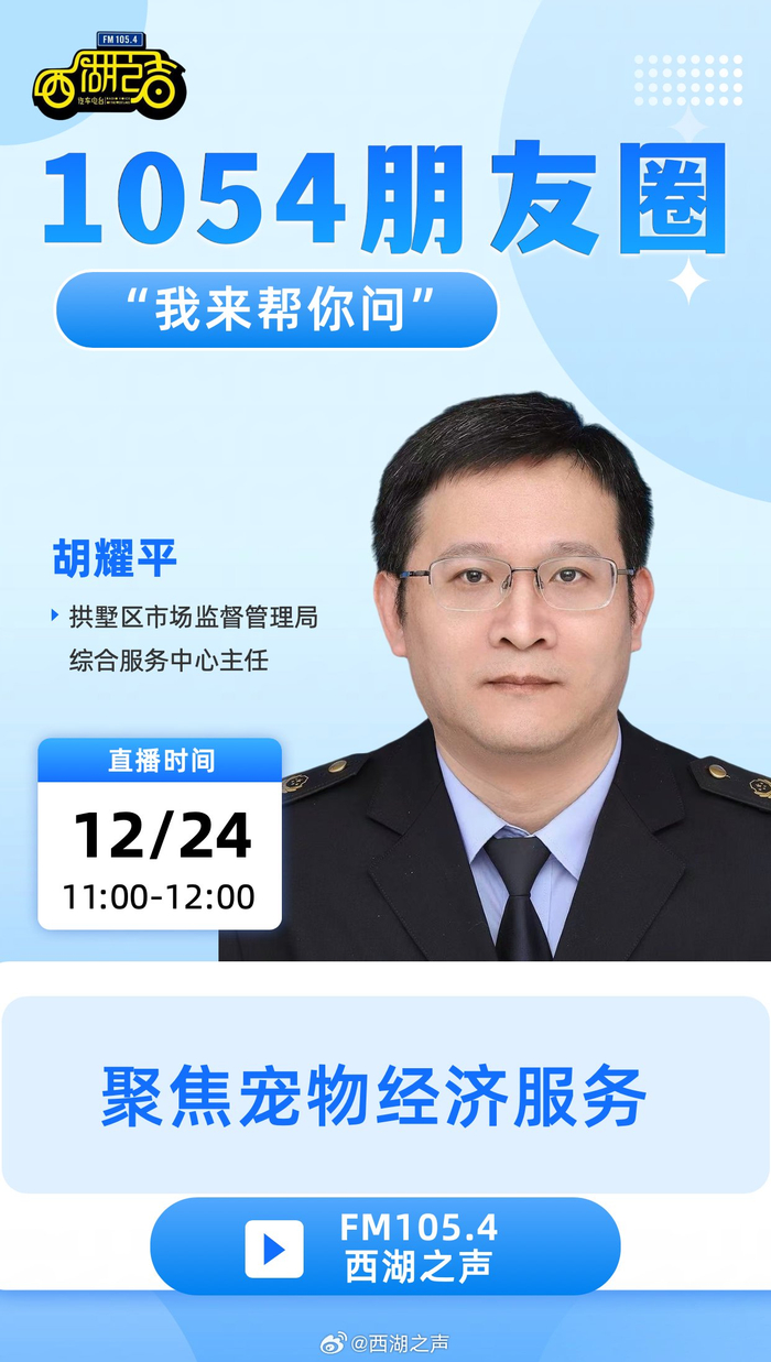 【“毛孩子”的困扰怎么解?拱墅区市场监管局有话说!】随着“毛孩子”成为越来越多家庭的重要成员,宠物服务消费的规模与专业性都在快速提升。然而,行业快速发展的同时,也伴随着服务质量参差、消费纠纷等问题。如何让宠物主消费得放心、安心?拱墅区市场监管局在该领域积极探索,从发布宠物医院放心消费名单,到建立全省首个政企协同宠物服务工作室,形成了一套独特的“拱墅经验”。12月24日11点,拱墅区市场监管局综合服务中心主任胡耀平做客《1054朋友圈》直播间进行解答!xx